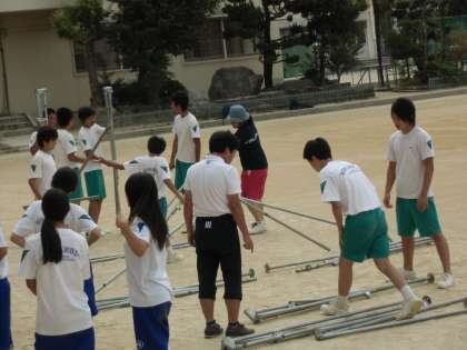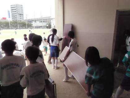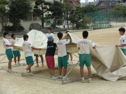 テント設営、机椅子の移動、ライン引き、石ころ拾い、そうじ。よく動いてくれました。ありがとう。