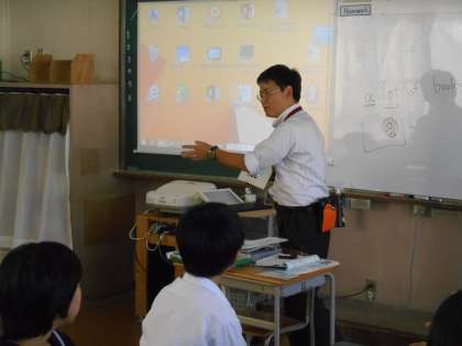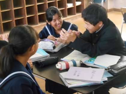 先生が「アメリカでは、稲も米とごはんも全部RICEです。何でか分かりますか?」と問うていました。「はい、では、30秒班で相談して。」(英語で)と言われて、相談しているところの写真です。