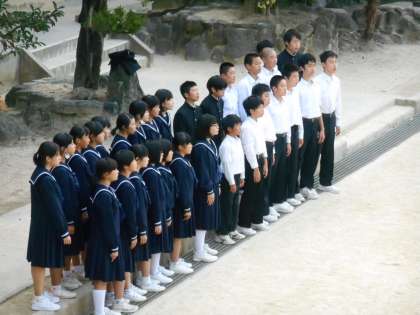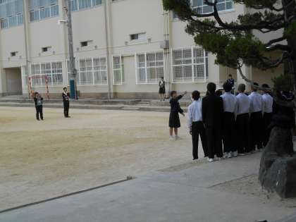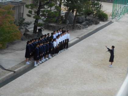 いよいよ合唱の時間です。グラウンドで練習するクラスです。