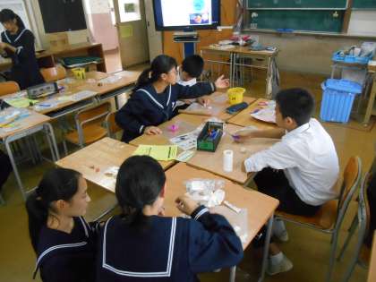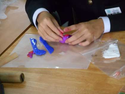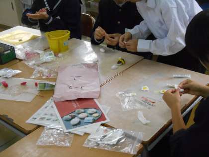 合成樹脂などをつかって、和菓子を創っています。「校長先生、これ何に見えますか。」と問うてきたので、「金つばですよね。」「いや、大福もちです。」とのこと。