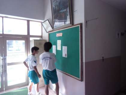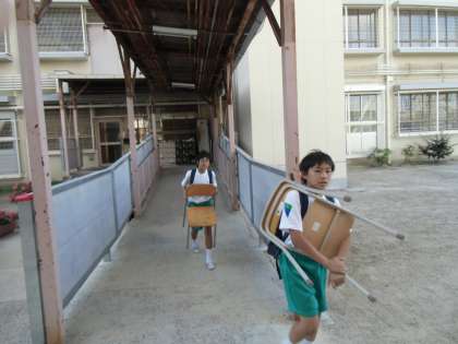 いよいよ体育大会。登校する生徒です。燃えてます。いすを応援席に運びます。祝電を読んでいます。