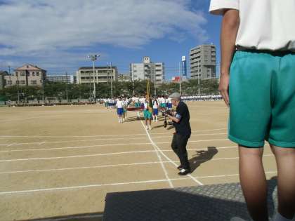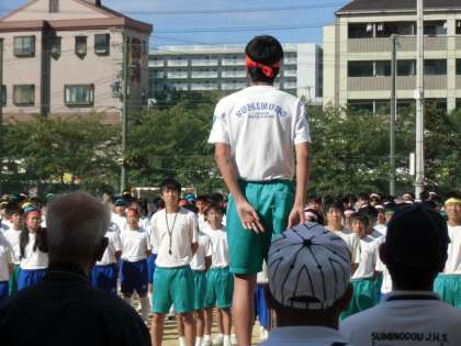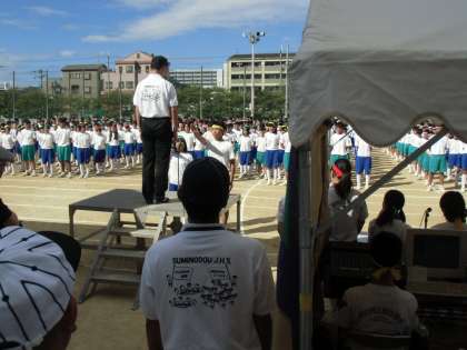 生徒会役員を先頭に生徒たちの入場です。朝礼台には生徒が指示の笛を吹きます。並び終えました。校長先生のお話です。この前に教頭の開会の言葉がありました。