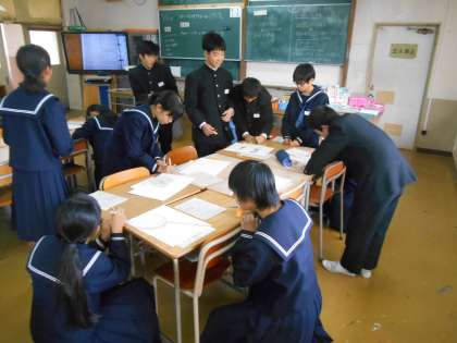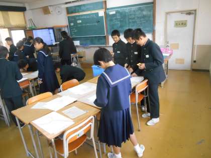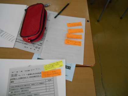 これが特にすばらしい場面でした。付箋(ふせん)にその絵のいいところを書いて貼っているところです。人の絵を見て回りながら、「すっげー、うまい。」とか「めっちゃ上手。」と言うのを聞きました。そう言われたら、ものすごくうれしいでしょうね。全員が誰かに肯定評価をしてもらえるように、割り当てが決まっています。これもすばらしい。