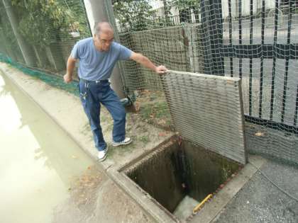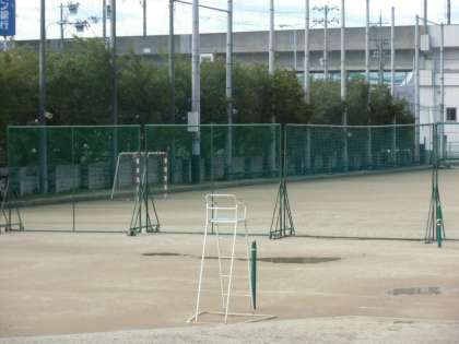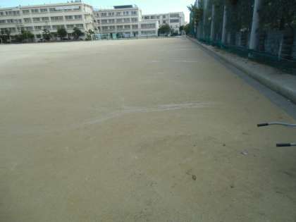 分かりましたか?何のことかわかりませんね。これはグランドの水が一気に外へ流れると近隣に迷惑をかけるので、少しずつ時間をかけて流れるように設計されているのです。おそらく1973年〜4年ごろの水害のときに考えられたんでしょうね。グランド中の水が一か所の会所に集められ、直径10センチほどの管から外へ徐々に流れるようになっているのです。校務員さんから教わりました。で、昼の3時にはあれだけプールになっていたグランドがこのとおり。放課後にはクラブがばっちり練習していました。