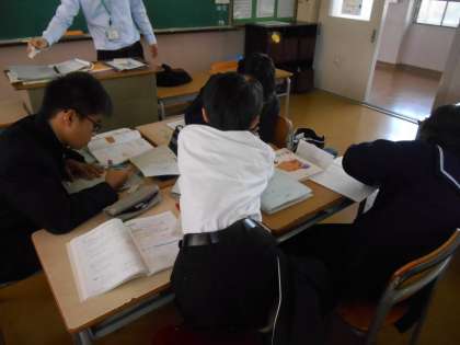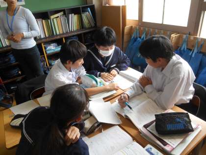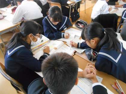 どうですか、この頭の寄り具合。すばらしいですね。最後まで緊張感のある授業でした。また、近くでどんな話(学び合い)をしているか聞いてみると、ていねいに、そして、間違いを優しく指摘しつつ、説明している人がいました。夕方、この授業の先生と振り返りをして、「〇〇たち、本当にすばらしいですね」と話し合いました。