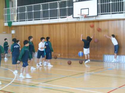今朝の体育館は男子バスケット部と女子バレー部です。