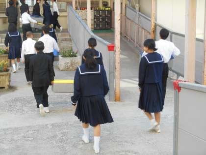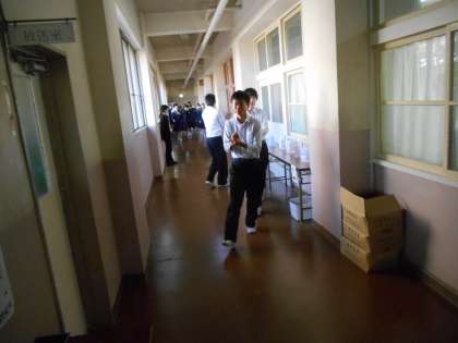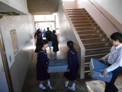 4限後、給食当番は各学年の各集合場所で給食当番がそろってから、配膳室に向かいます。手を消毒し、配膳室へ行きます。