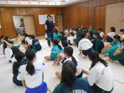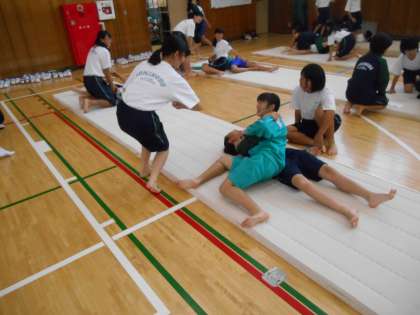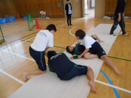 柔道の袈裟(けさ)固めを練習しています。事前に予習してきて、その図を見たり、本を見たりしてまず、やっています。その後に正しいやり方を確認します。もちろん、安全面に配慮しています。始めから教えるときもありますが、ときには、自分たちで「ああだ、こうだ」言いながら試行錯誤して、取り組むと効果があります。