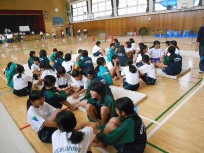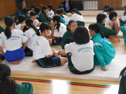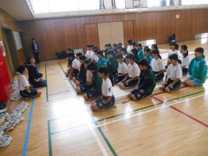 実技練習が終わり、今日の振り返りを各グループで行いました。この時間に互いのいいとろこ、今日初めて知ったこと、疑問点などを出し合い、次の授業につなぎます。最後は柔道は礼に始まり、礼に終わるのとおり、正座して号令のもと、気持ち良く終わりました。
