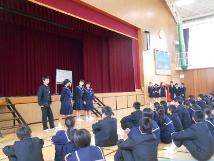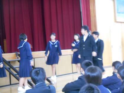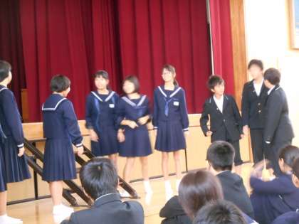 校風委員会です。住中お得意の寸劇が始まりました。右手から、学生服をだらしなく着た男子とスカートを短くした女子が登場しました。何が始まるのでしょうか。