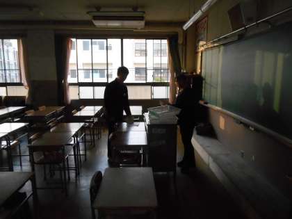 朝7時30分の3階多目的室と教室です。生徒会役員の人たちが、今週金曜日の生徒総会の打合せを行うところです。いきなりの出会いだったので、驚きました。すばらしい。ありがとう。このあと、泉小へあいさつ運動に行きました。