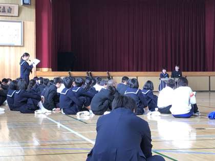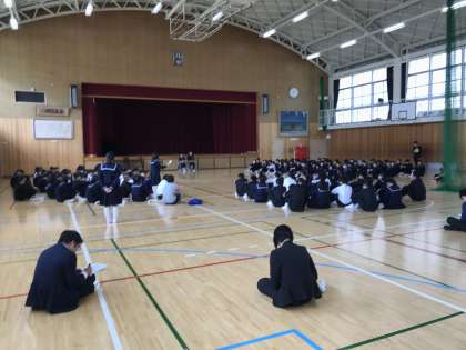 2年生が金曜日の本番を前に学年総会を行いました。シーンと静まり返ったなかで、真剣な意見が続きました。クラスのこと、欠席封筒のこと、いろいろです。