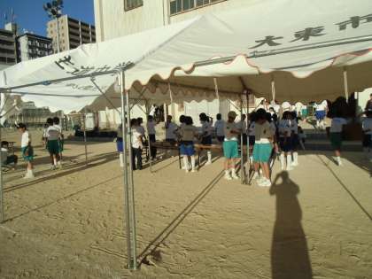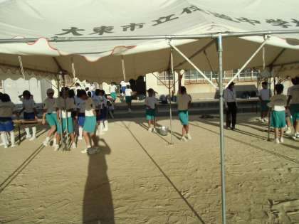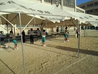 あとかたづけです。テントをかたづけています。写真では分かりにくいですが、テントの布の部分のひもをほどき、かたいジョイントのところをはずすということもやっています。テントの下の机・椅子もかたづけてくれました。生徒が先生の指示のもと、よくやってくれました。