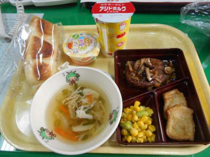 谷川中学発案のスペシャルメニューなんですが、なんと牛乳が今日はありません。飲むヨーグルトが出ました。おいしかったです。