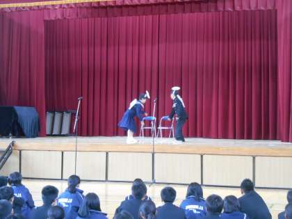 生徒総会恒例の寸劇です。生徒総会でみんなに気づいてほしいこと、がんばってほしいことがメッセージになっています。