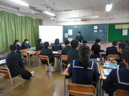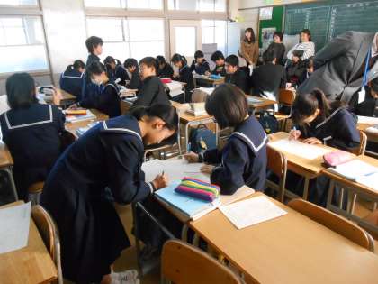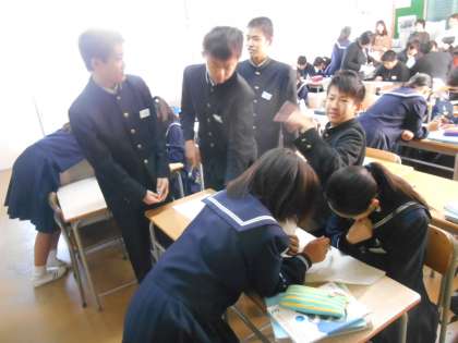 2、3枚目は数学の授業です。スクランブルでの学び合いの最中でした。よく頭が寄っていました。