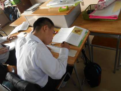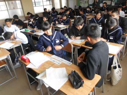 このクラスの道徳を長く参観しました。一人ひとりに短冊形の用紙(磁石つき)を渡し、自分の意見を書き込み、まずは前後左右の人と意見交流です。