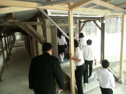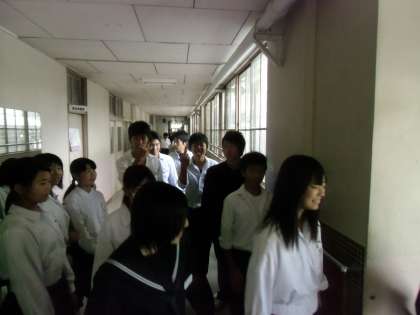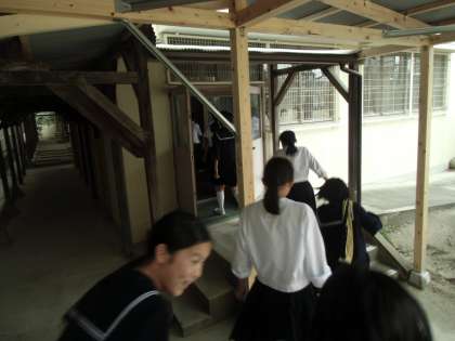 今日は風が強く、扉が風でバシッと締まり、危険なのでドアのところにいました。生徒たちが外に一瞬出て、「おっ、さぶ」と言っています。