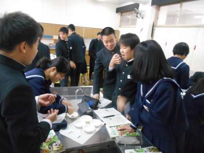 グループごとに甘味、酸味、苦み、辛みなどを実験しています。