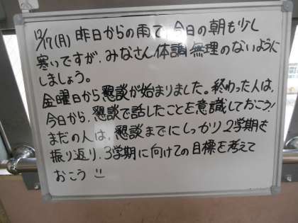 いよいよ今週末で2学期終了です。懇談で話された内容を大事にして3学期を迎えてほしいです。