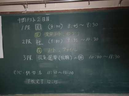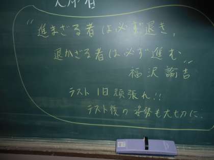 1枚目は今日の予定(2年)です。2枚目は今日の名言です。「進まざるものは必ず退き、退かざるものは必ず進む。」かっこいいですねえ。逃げたいときもありますが。朝、巡回していると、少し早い目に教室に来て、勉強している生徒がいました。その生徒も私の顔を見て、「おはようございます。」と気持ちよくあいさつしてくれました。今日は3時間目が生徒会役員選挙です。