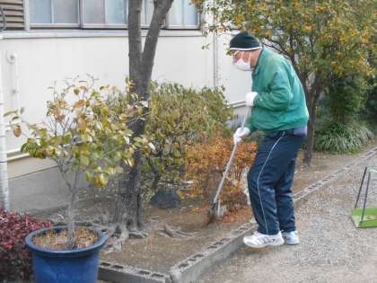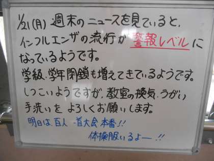朝の寒いところ、環境整備をしていただいています。黒板は、まさに警報レベルです。1年生で学級閉鎖が出ました(既報)。