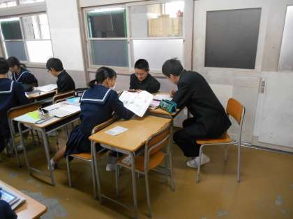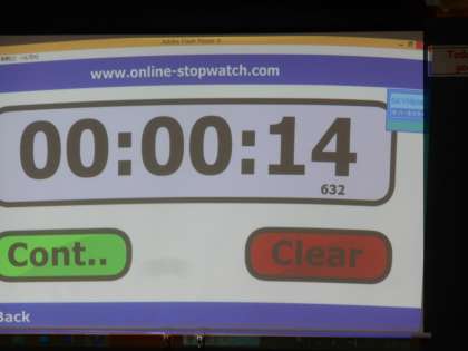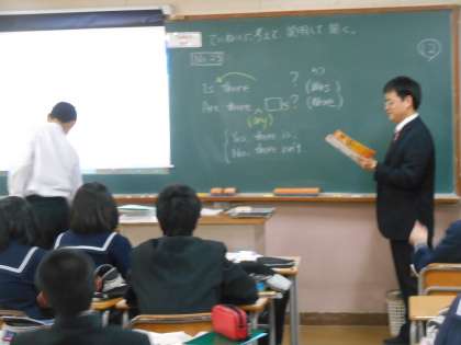 この授業もたいへんおもしろかったです。1枚目は3人で英文を早口で読み、14秒で読みました。すばらしい速さです。なぜなら、生徒から「先生、一人で読んで12秒で読めますか?」と聞かれ、3枚目で先生が挑戦しました。英語の先生が一人で超早口で読んで、ジャスト12秒。生徒3人の14秒がどれだけ速いか。すばらしい。