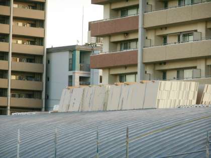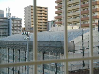 写真に写っているのは、体育館の屋根を覆うカバー材と思われます。先日、クレーン車で上に運ばれました。こういう光景も珍しいので撮影しました。