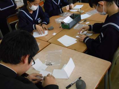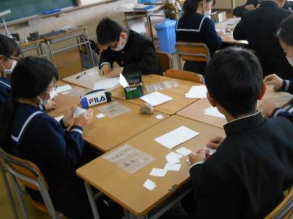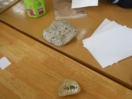 石に紙を何枚も貼り付けて張り子の型を作ろうとしています。