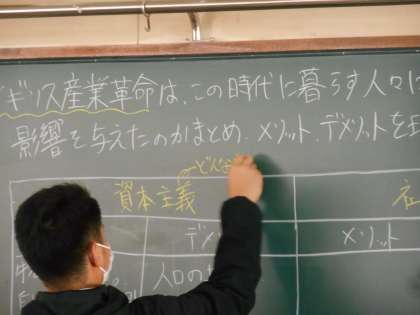 産業革命が人々に与えた影響や、資本主義と社会主義のメリット、デメリットについて意見を言い合っていました。「資本主義は、○○で…。」と言う姿は少しかっこよかったです。