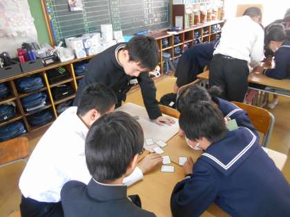 百人一首です。心から楽しんでいる様子でした。(このクラスの次の授業担当の先生が、「〇組、燃え尽きていました。」と言っていました。)