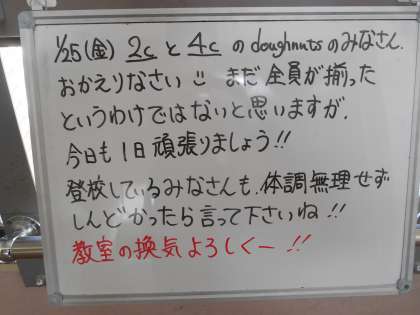 2組と4組が学級閉鎖が終わり、登校となりました。生徒に聞くと、「やっぱり、学校がある方がいいです。」「先生、僕、家のこといっぱい手伝わされました。学校が始まってうれしいです。」と言っていました。