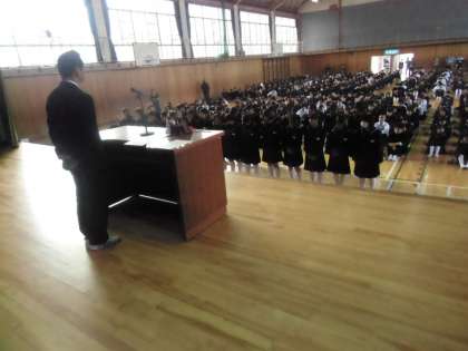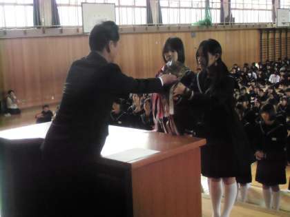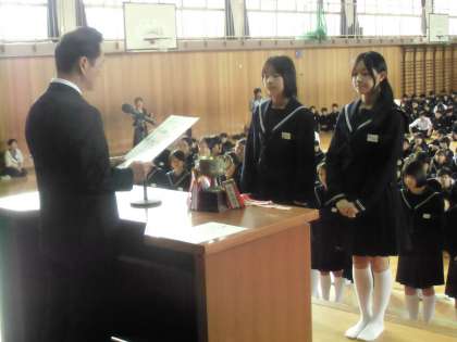 女子バスケット部の表彰です。代表の二人が賞状と優勝カップを校長先生からもらいました。すばらしい。