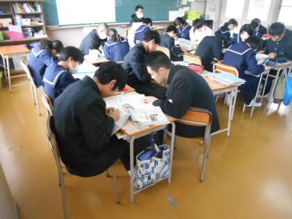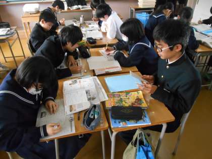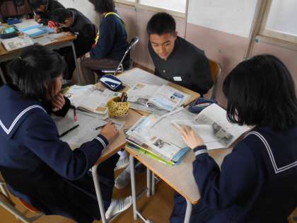 プリントの問題を解き、答えを確認しています。このあと、確認テストが予定されています。その前に、頭を整理し、記憶しています。