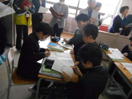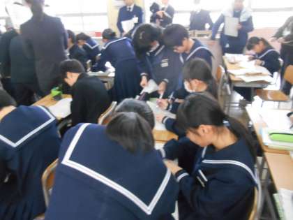 課題の説明に5分かけ、30分間は生徒がその課題に向けて取り組むという展開でした。その30分はほとんど先生は話しません。生徒が調べ、互いに聞き合い、理解できた人を探し、自分で聞きに行きます。すばらしい流れでした。