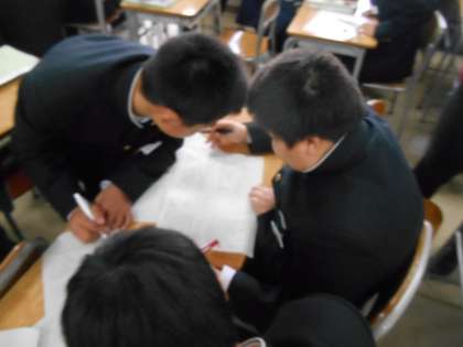 3枚目は確認テストをしているところです。30分間、生徒同士で問題を解き合い、学び合う中で、始めは「分からない。」と言っていた生徒が確認テストで正解を書いているのが何人もいました、これはその30分で学び合い・協同が効果があった証拠と言えます。