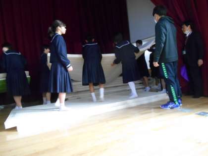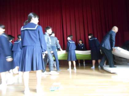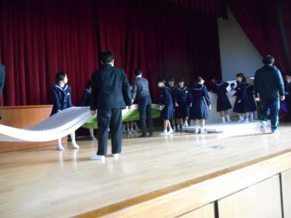 これは朝礼の直前に20人くらいの生徒が体育館の舞台に置いてあったマットを急きょ、移動してくれている写真です。インフルエンザでしばらく朝礼も集会もなかったので、マットが置きっぱなしになっていました。ありがとう。