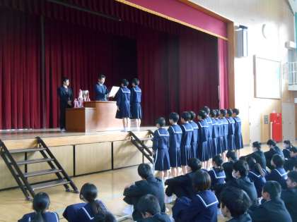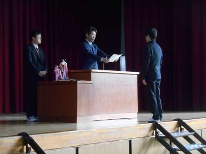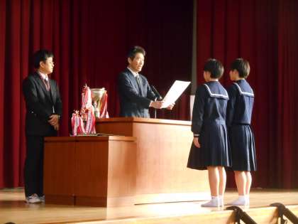 表彰は何度やってもうれしいです。女子バレー部と美術部の人の表彰をしているところです。