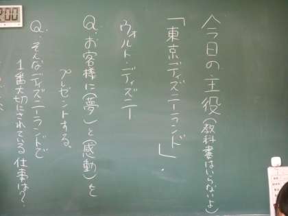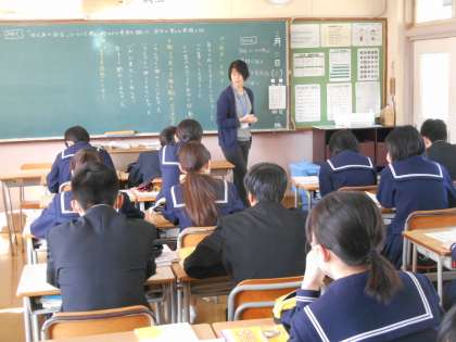 クラスごとに教材文が異なります。生徒の意見が黒板に書かれています。