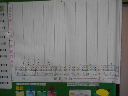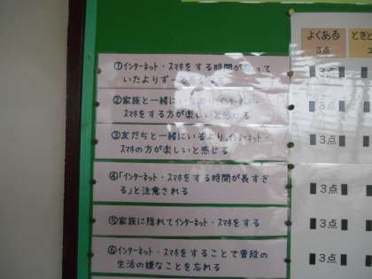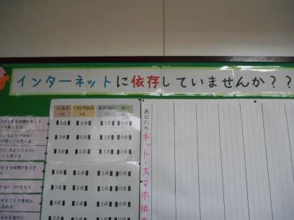 保健室前に掲示してあるものです。分かりにくいですが、インターネットについて質問が多く書かれています。回答によって依存度が分かるようになっています。