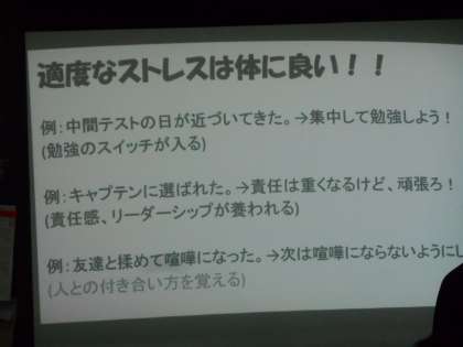 保健で、悩みごとがあれば、一人で悩まずに誰かに相談すること。適度なストレスは人間にとって必要なこと、などを学習していました。