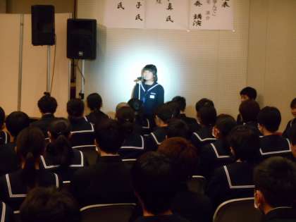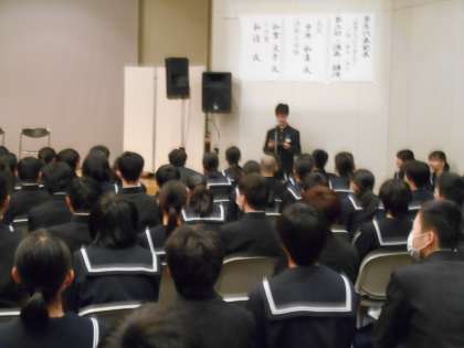 2年生が昔の元服にならって、2年の集い(立春式)を行いました。進行役の生徒の言葉で開会しました。