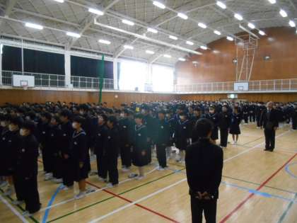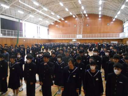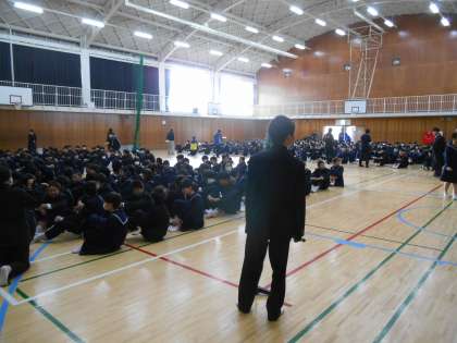 今朝は生徒集会の日でした。生徒会役員の生徒が整列させていました。始まるところです。