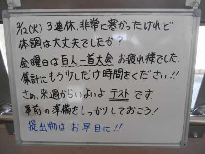 黒板のとおり、寒い日が続きました。本校では今のところ、インフルエンザは減っています。しかし、油断大敵です。