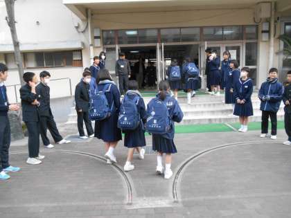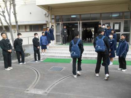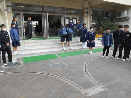 本当なら、生徒会役員及び評議員の人たちがハイタッチする中を登校する予定でしたが、インフルエンザの感染予防として、ハイタッチを自粛しています。でも、元気なあいさつを交わして生徒のみんなが登校していました。