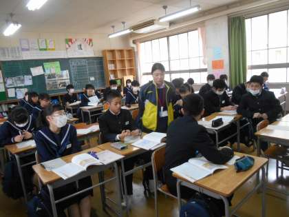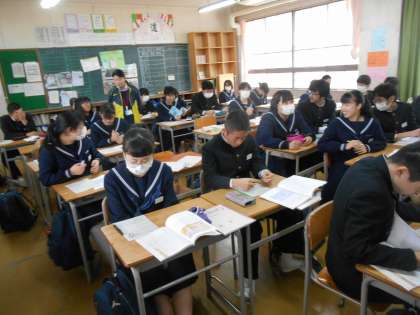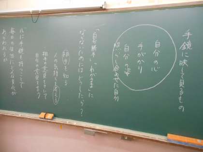 黒板には生徒の考えが並んでいます。先生は一人ひとりの横に位置しながら、意見を聞きとっています。大きな声で言わなくても、つぶやくだけで良いので、心情をはき出しやすいと感じました。すばらしい。