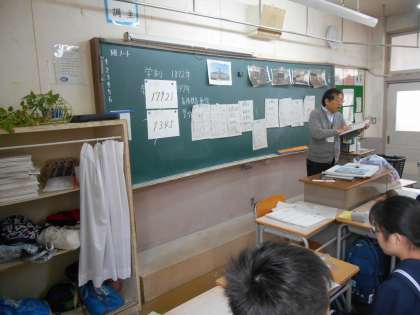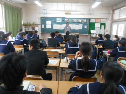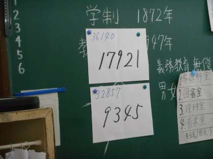 黒板いっぱいに資料となる写真が貼ってあります。写真に写っている数字は1872年、日本で学制(学校制度)の法令が発布された当時のものです。先生は「なぜ、女子が学校に行く率が極端に低い(4人に1人)のか。」と質問していました。手が挙がり、「当時の日本では女子には教育は必要ないと考えられていたからです。」と発表する生徒がいました。先生が「正解だ。」と返事し、細かな説明が続きました。今から考えると信じられないことがありましたね。