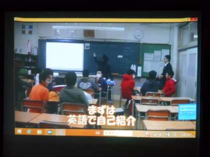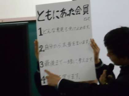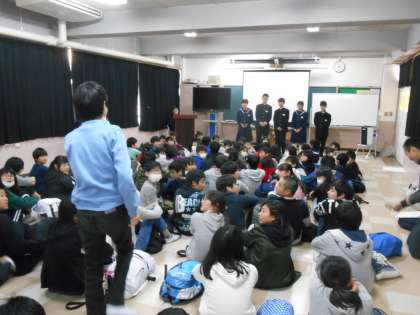1枚目は、生徒会会長から「ともにあった会」に入る人の条件を説明しているところです。2枚目は住道北・南小学校が先日来たときの体験授業のビデオを見ています。3枚目はそれらが終わって最後に生徒会の人たちに小学生が質問をしているところです。クラブは用事があれば帰ることができるのか。給食はおいしいのか。クラブと勉強の両立はできるのか等が質問されました。