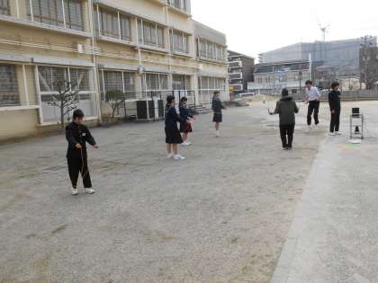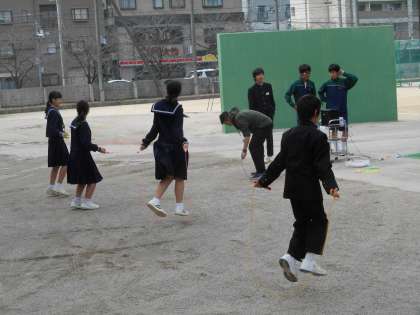音楽をかけて縄跳びをしていました。先生も必死です。生徒も昼休みにやるだけあって、好きなのでしょう、軽々やっていました。