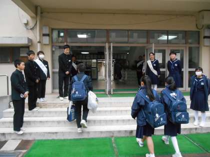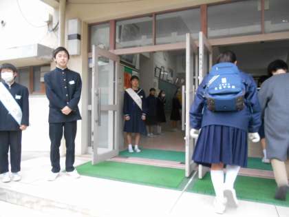 平成31年度前期生徒会選挙を目前に選挙活動が始まっています。たすきをかけた候補者があいさつ運動に立ちました。やる気まんたんです。